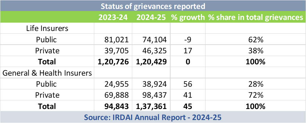 - The number of grievances reported under life insurance remained unchanged at around 1.2 lakh, compared to 2023–24, while grievances under health insurance rose sharply by 20 per cent.